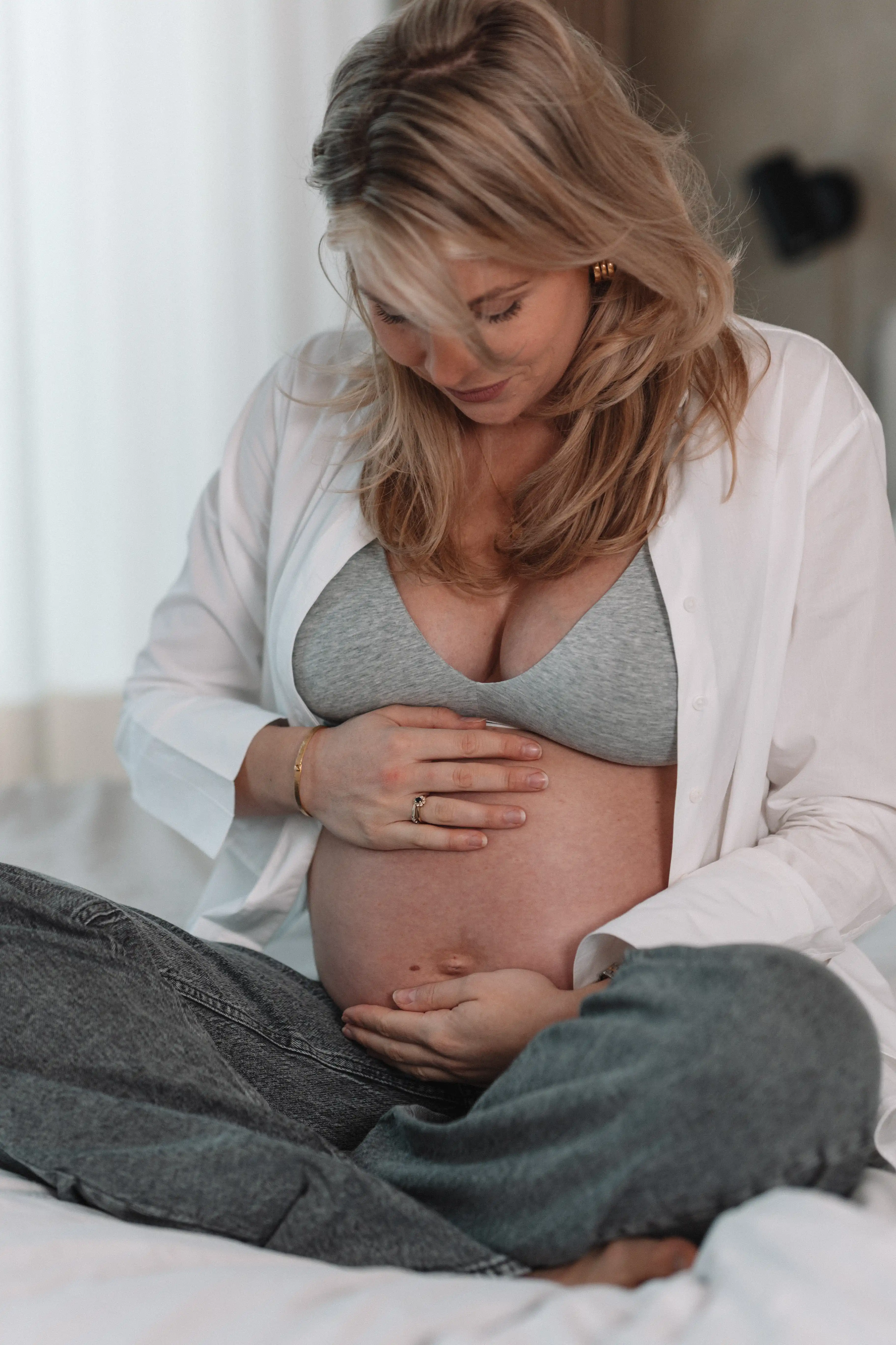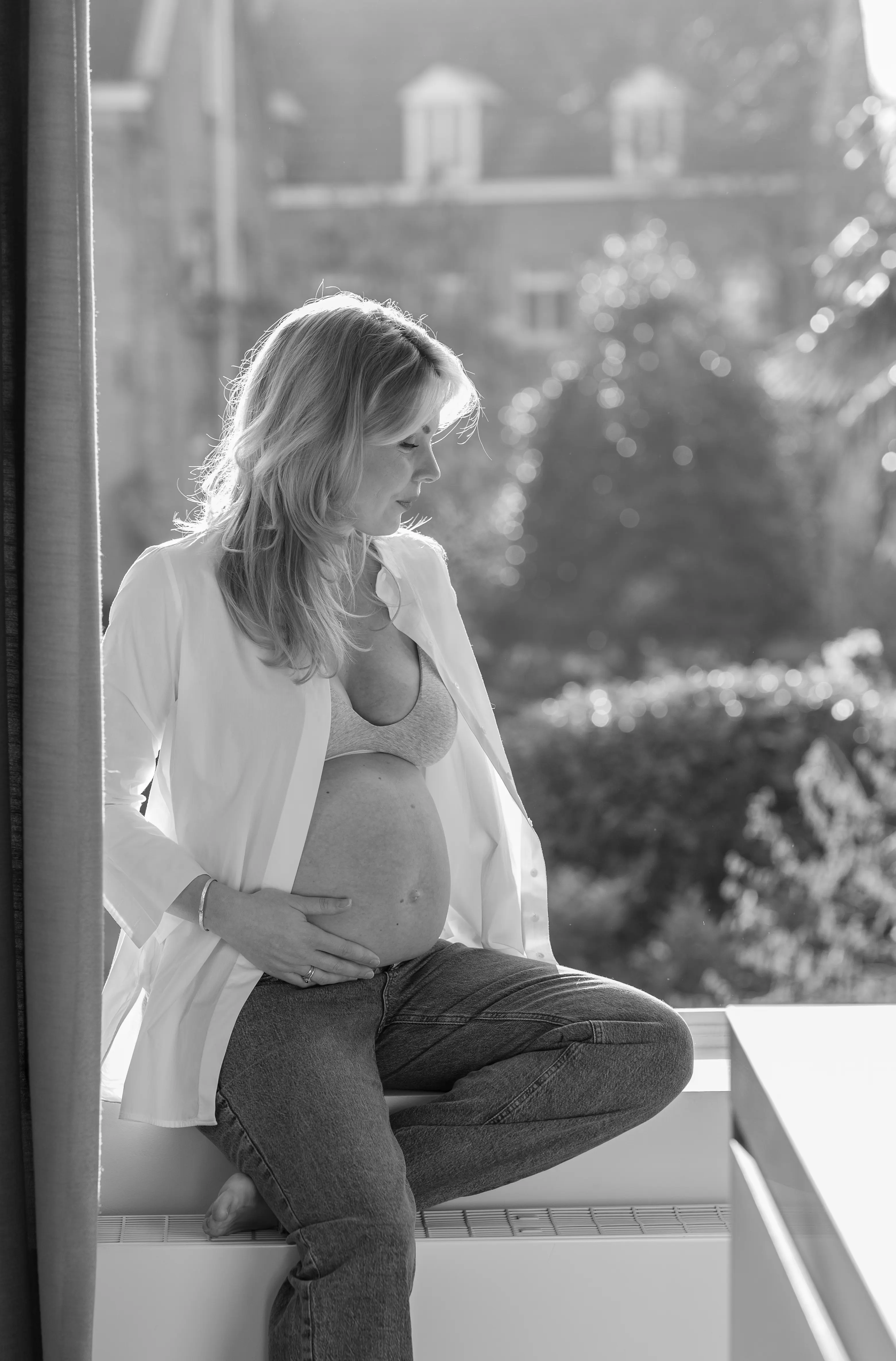 Een zwangerschapsshoot is iets intiems. Buiten of op drukke locaties kun je je snel bekeken voelen. Thuis heb je daar geen last van. Hierdoor kun je jezelf zijn zonder ongemak. Dat zorgt voor zachtere, meer ontspannen foto’s.